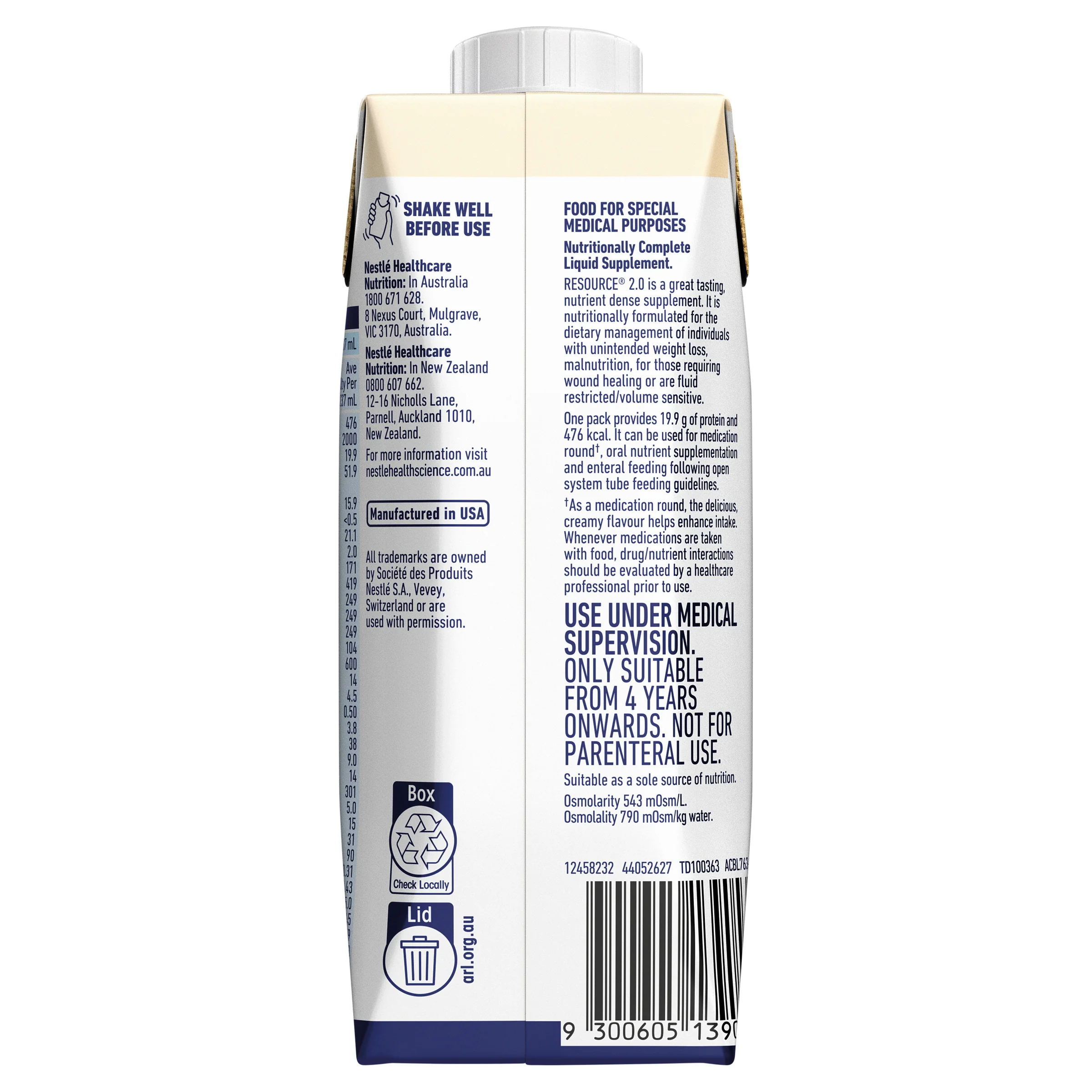 RESOURCEĀ® 2.0 is a food for special medical purposes specifically formulated for medical conditions where nutritional needs cannot be met through diet modification alone. Must be used under medical supervision.